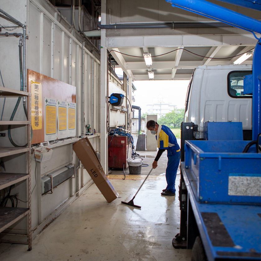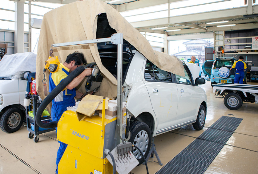 現在7人のスタッフが、安全に気を配りながら、正確で丁寧、そしてできる限りお客様に早く納車できるようスピード感をもって作業に取り組んでいます。そのために複数の車両を同時に作業できるよう、広々とした空間を備え、専用の機材を各種取り揃えています。
