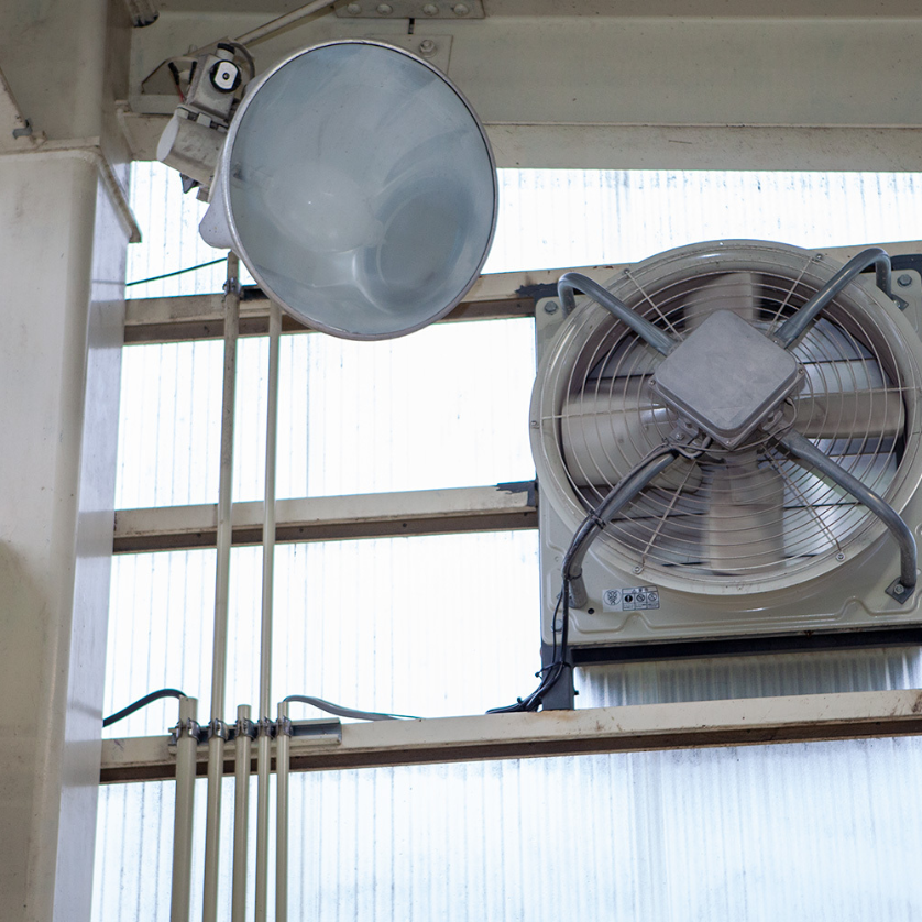 大型ファンで換気を常に行い空気環境を清浄化。室内温度の調節にも一役。