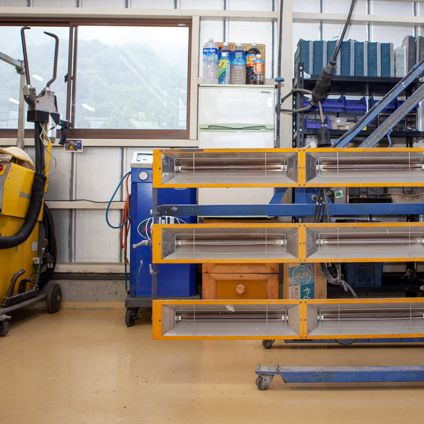 室内では誇りのほぼない状態で、塗装と乾燥を行います。